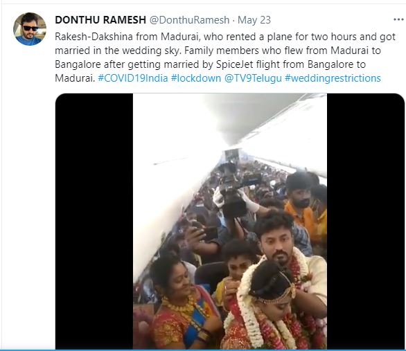 को’रोना भा’इरसको प्रतिबन्दको कारण भारतमा एक जोडिले विमान भाडामा लिएर धुमधामसँग विवाह गरेको छ । सामाजिक सञ्जालमा देखिएको उक्त भिडियोहरुमा विमान भाडामा लिएर १५० भन्दा बढी निम्तालुहरूको बीच आकाशमा विवाह गरेका छन् ।