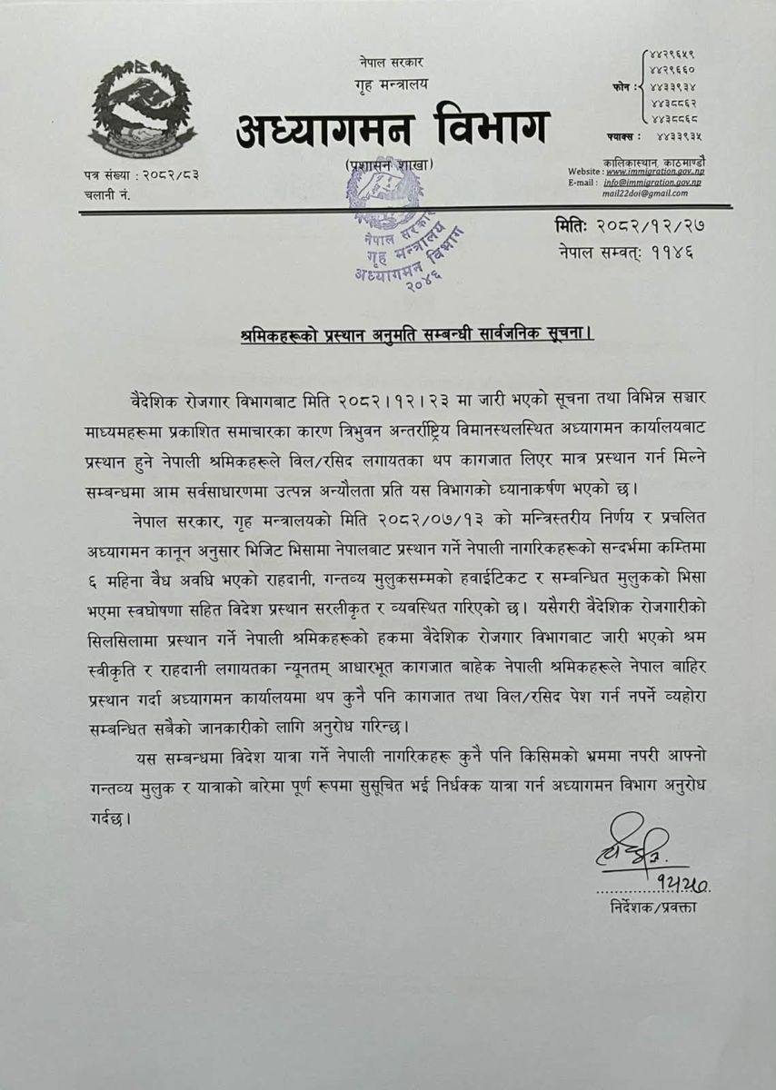 ‘वैदेशिक रोजगार विभागबाट जारी भएको श्रम स्वीकृति र राहदानीलगायतका न्यूनतम आधारभूत कागजातबाहेक नेपाली श्रमिकहरूले नेपालबाहिर प्रस्थान गर्दा अध्यागमन कार्यालयमा थप कुनै पनि कागजात तथा बिल-रसिद पेस गर्न नपर्ने व्यहोरा सम्बन्धित सबैको जानकारीका लागि अनुरोध गरिन्छ’, अध्यागमन विभागद्वारा जारी सूचनामा भनिएको छ ।