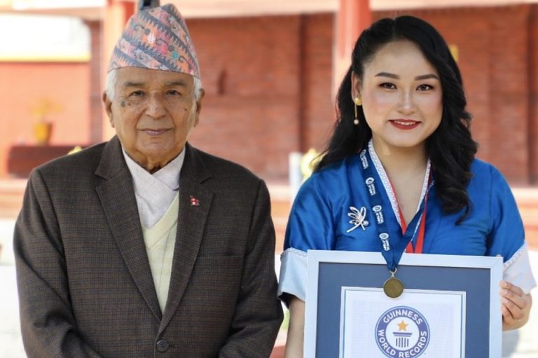 काठमाडौं– सोलुखुम्बुको कालापत्थरमा सर्वाधिक उचाइमा नृत्यको रेकर्ड राख्दै गिनिज बुक अफ वल्र्ड रेकर्डमा नाम दर्ता गराएकी अभिनेत्री छिरिङ शेर्पाले सोमबार राष्ट्रपति रामचन्द्र पौडेलबाट ‘गिनिज बुक अफ वल्र्ड रेकर्ड’को प्रमाणपत्र